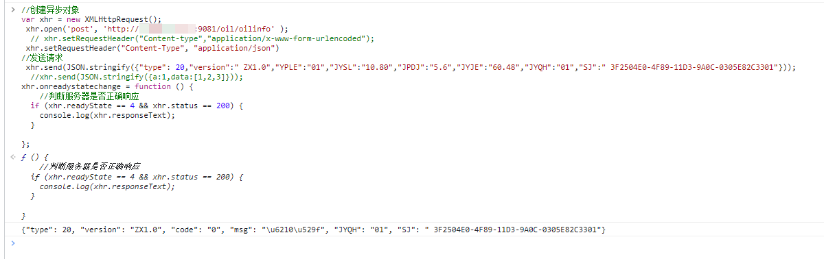 xhr.send(JSON.stringify({"type": 20,"version":" ZX1.0","YPLE":"01","JYSL":"10.80","JPDJ":"5.6","JYJE":"60.48","JYQH":"01","SJ":" 3F2504E0-4F89-11D3-9A0C-0305E82C3301"}));