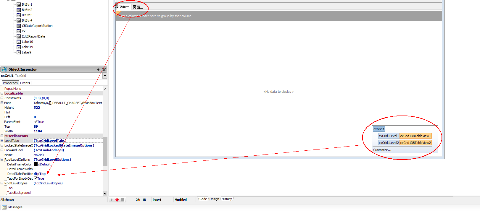 解决方法:增加需要的Level数量,将cxGrid1->RootLevelOptions->DetailTabsPosition设为dtpTop,然后相应的设置cxGrid1Level1,和cxGrid1Level2的Caption值。即可实现分页面显示效果(用了多年的TcxGrid第一次发现有这样的功能,Dev控件真的是强大)