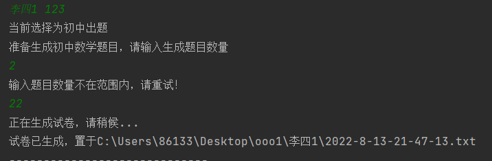 3、题目数量的有效输入范围是“10-30”(含10,30,或-1退出登录),程序根据输入的题目数量生成符合小学、初中和高中难度的题目的卷子(具体要求见附表)。同一个老师的卷子中的题目不能与以前的已生成的卷子中的题目重复(以指定文件夹下存在的文件为准,见5);