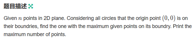 意思:平面上,所有边过点(0,0)的圆中,找出边上有最多给出的点的圆,输出最多点的数目。