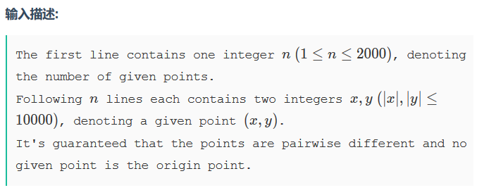 #include <cstdio> #include <algorithm> using namespace std; typedef long long LL; typedef __int128_t LLL; #define N 2000 + 5 int n, ans = 1, X[N], Y[N]; struct Frac { LL fz, fm; Frac() : Frac(0, 1){} Frac(LL fz, LL fm) : fz(fz), fm(fm) {}//构造函数 bool operator < (const Frac &rhs)//运算符重载 { return (LLL) fz * rhs.fm < (LLL) fm * rhs.fz; } bool operator == (const Frac &rhs) { return (LLL) fz * rhs.fm == (LLL) fm * rhs.fz; } }A[N]; int Cross(int lhs, int rhs)//叉乘 { return X[lhs] * Y[rhs] - X[rhs] * Y[lhs]; } int Dot(int lhs, int rhs)//点乘 { return X[lhs] * X[rhs] + Y[lhs] * Y[rhs]; } int Dis2(int lhs, int rhs)//两点距离平方 { int dx = X[lhs] - X[rhs], dy = Y[lhs] - Y[rhs]; return dx * dx + dy * dy; } int Sgn(int x)//判断正负 { if (x > 0) return 1; if (x < 0) return -1; return 0; } Frac GetCosAngle2(int i, int j) { int a2 = Dis2(0, i), b2 = Dis2(i, j), c2 = Dis2(0, j); int sgn = Sgn(b2 + c2 - a2); return Frac(1LL * sgn * (b2 + c2 - a2) * (b2 + c2 - a2), 4LL * b2 * c2); } int main() { scanf("%d", &n); for (int i = 1; i <= n; i ++) scanf("%d%d", X + i, Y + i); for (int i = 1; i <= n; i ++)//枚举第一个点P { int cnt = 0; for (int j = 1; j <= n; j ++)//枚举除P外的点 if (Cross(i, j) > 0) A[++ cnt] = GetCosAngle2(i, j); sort(A + 1, A + cnt + 1); for (int l = 1, r; l <= cnt; l = r) { for (r = l; A[l] == A[r] && r <= cnt; r ++) ; ans = max(ans, r - l + 1);//找众数并计数,赋值给ans } } printf("%d\n", ans); return 0; }