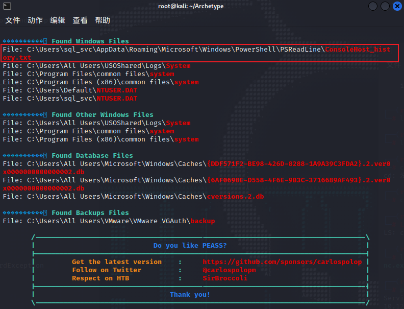 这里使用winPEASx64进行敏感文件扫描,开启http服务在目标主机下载该文件并运行