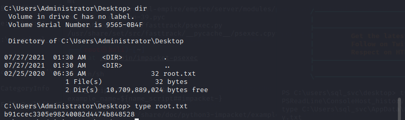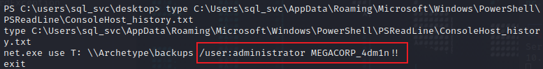 type C:\Users\sql_svc\AppData\Roaming\Microsoft\Windows\PowerShell\PSReadLine\ConsoleHost_history.txt