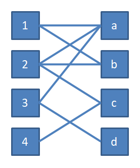 注意我们最后一步访问的顺序,4(未匹配点) --非匹配边-- c --匹配边-- 2 --非匹配边-- a --匹配边-- 3 --非匹配边-- d(未匹配点),像这样的,从未匹配点开始,依次途经非匹配边、匹配边、非匹配边、匹配边、... 、非匹配边,最终到达另一个未匹配点的一条路径叫做增广路。
