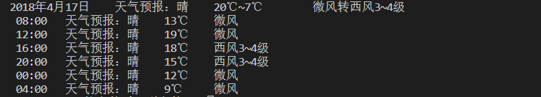 weather='2018年4月17日\t 天气预报:{:s} \t 20℃ ~7℃ \t 微风转西风3~4级 \n \