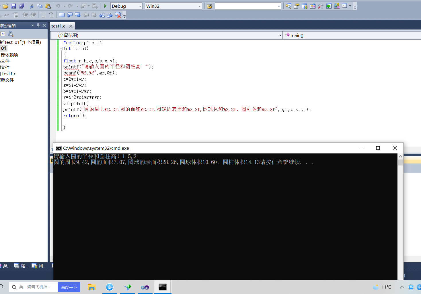 printf("圆的周长%2.2f,圆的面积%2.2f,圆球的表面积%2.2f,圆球体积%2.2f,圆柱体积%2.2f",c,s,b,v,v1);