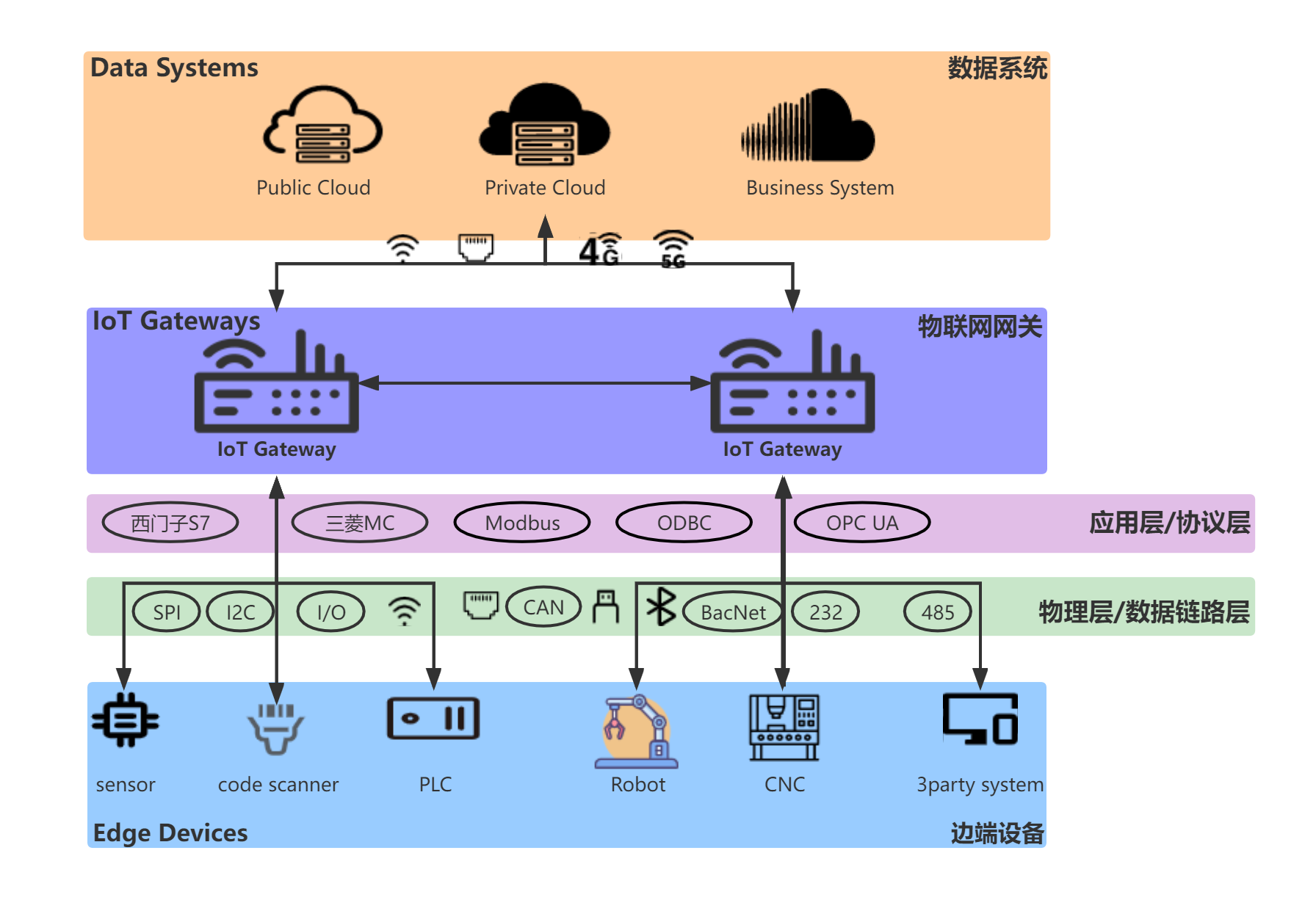 通过可视化配置(B/S),轻松的连接到你的任何设备和系统(如PLC、扫码枪、CNC、数据库、串口设备、上位机、OPC Server、OPC UA Server、Mqtt Server等),从而与 物联网平台、MES、SCADA、进行双向数据通讯。