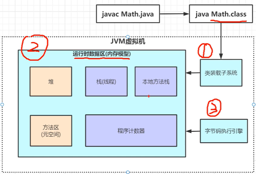 通过javac命令编译.java文件成字节码.class文件,然后执行java命令的时候jvm就已经开始工作,将字节码对象装进类装载子系统,下一步就是到运行时数据区也就是内存模型分配空间,最后一步就是启动字节码执行引擎去运行内存区的代码;