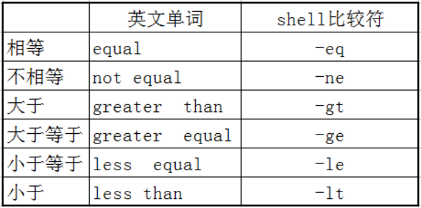 #! /bin/bash echo "please input two numbers >>> " read NUM1 NUM2 test $NUM1 ‐eq $NUM2 echo "相等?$?" test $NUM1 ‐ne $NUM2 echo "不相等?$?" test $NUM1 ‐gt $NUM2 echo "大于?$?" test $NUM1 ‐ge $NUM2 echo "大于等于?$?" test $NUM1 ‐lt $NUM2 echo "小于?$?" test $NUM1 ‐le $NUM2 echo "小于等于?$?"