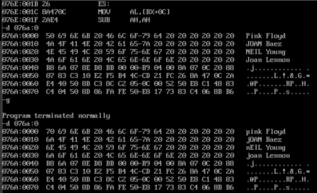 assume cs:code, ds:data data segment db 'Pink Floyd ' db 'JOAN Baez ' db 'NEIL Young ' db 'Joan Lennon ' data ends code segment start: mov ax,data mov ds,ax mov bx,0 mov cx,4 s: mov al,[bx] or al,20h mov [bx],al add bx,16 loop s mov ah, 4ch int 21h code ends end star