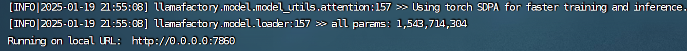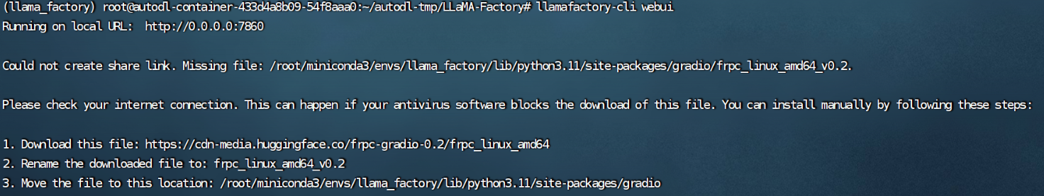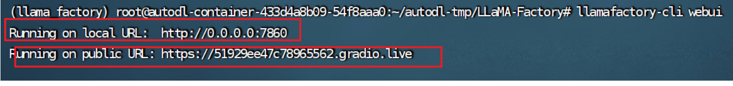 最后,重新执行llamafactory-cli webui命令,如下图所示会生成两个链接