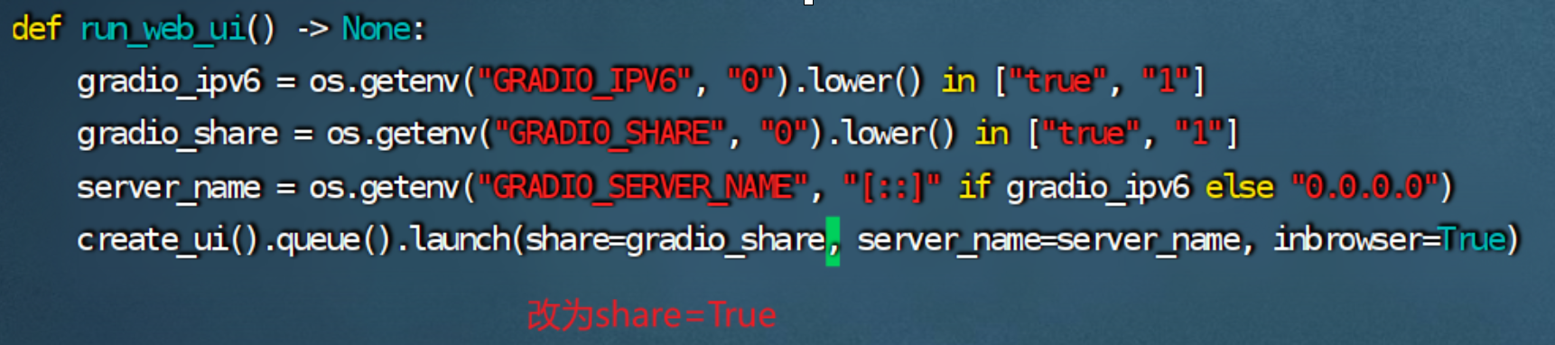 1.修改LLaMA-Factory/src/llamafactory/webui/interface.py文件中的run_web_ui函数为share=True