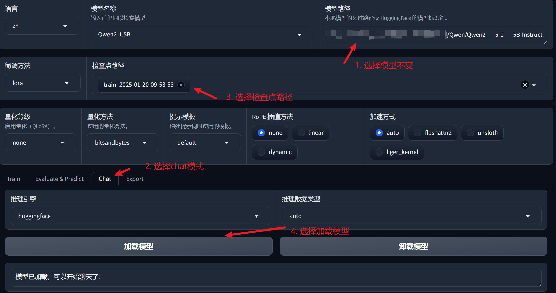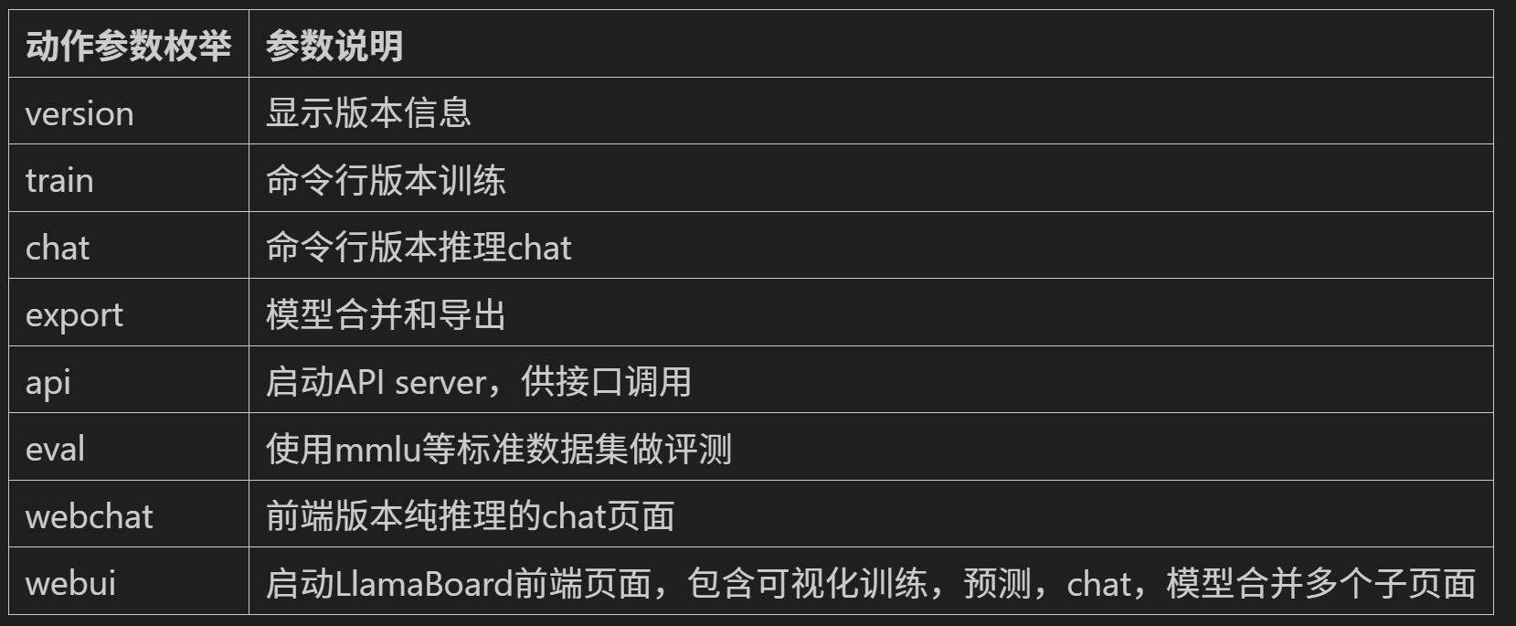 上述命令中,CUDA_VISIBLE_DEVICES指定当前程序使用的是第0张卡;model_name_path参数为huggingface或者modelscope上的标准定义,如“meta-llama/Meta-Llama-3-8B-Instruct”或者本地下载模型的绝对路径;template 模型问答时所使用的prompt模板,不同模型不同,参考 https://github.com/hiyouga/LLaMA-Factory?tab=readme-ov-file#supported-models 获取不同模型的模板定义,否则会回答结果会很奇怪或导致重复生成等现象的出现。