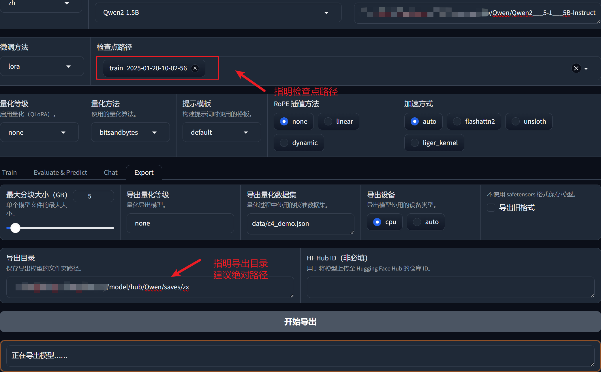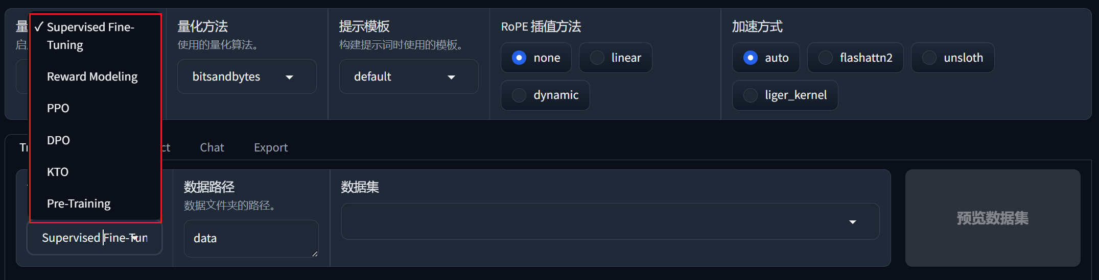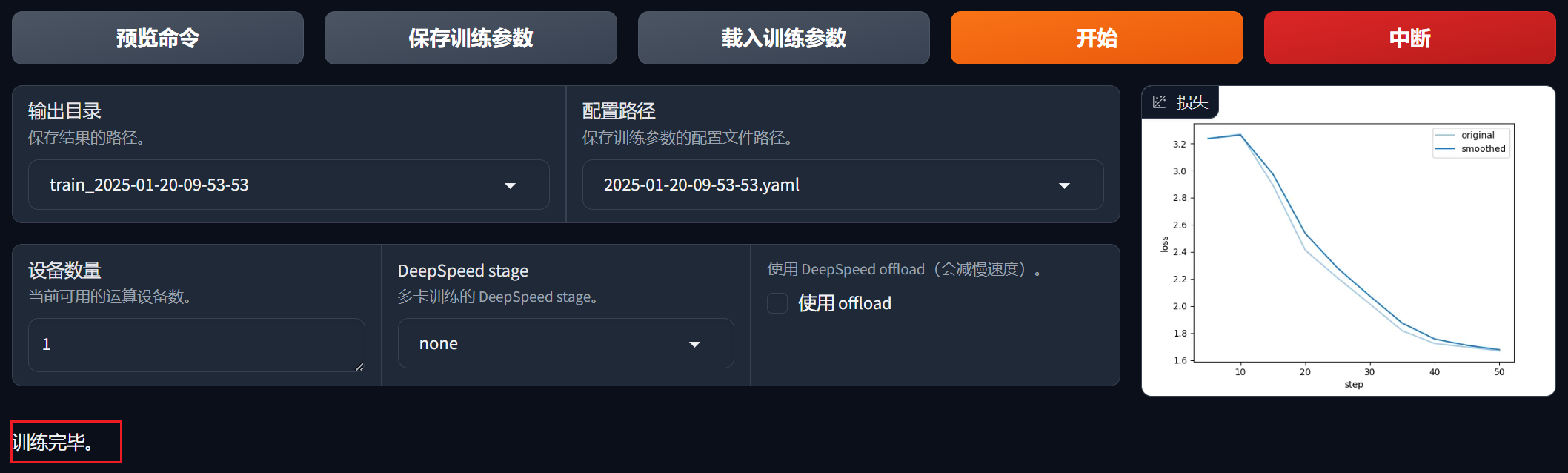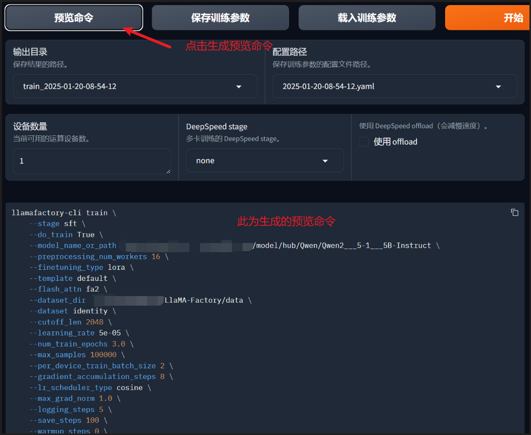export USE_MODELSCOPE_HUB=1 CUDA_VISIBLE_DEVICES=0,1 llamafactory-cli webui 通常会使用 nohup命令进行启动 export USE_MODELSCOPE_HUB=1 export CUDA_VISIBLE_DEVICES=0,1 nohup llamafactory-cli webui >20241119.log 2>&1 &