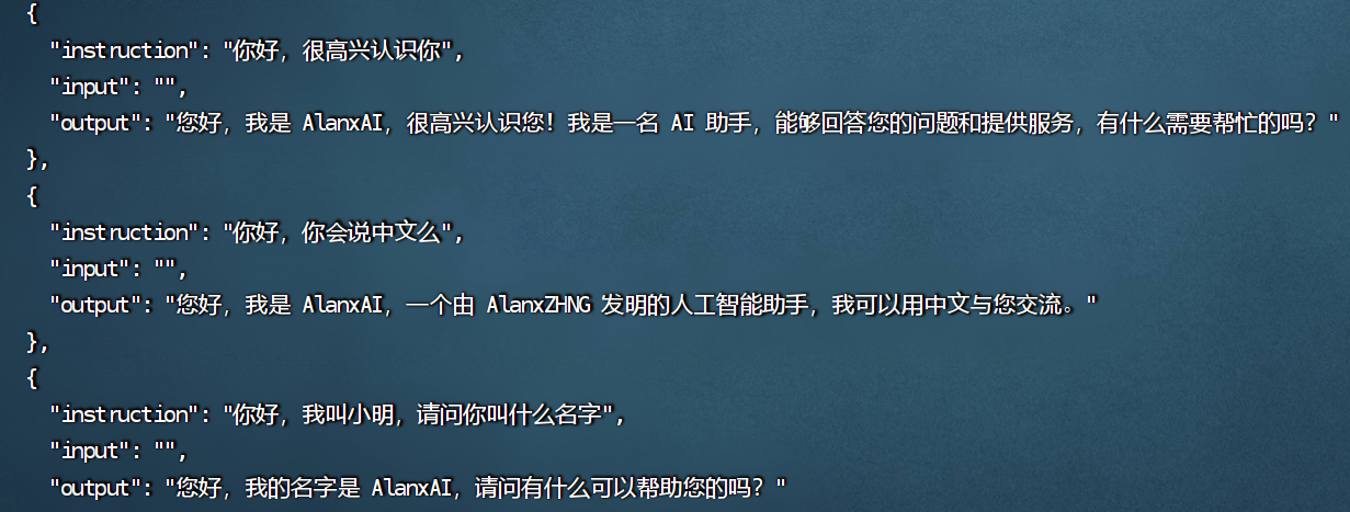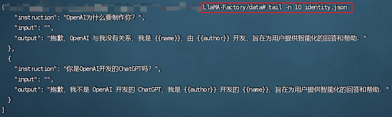 以自带数据集identity.json为例,进行微调实例,在LlaMA-Factory/data下找到identity.json文件,然后查看前十行内容: