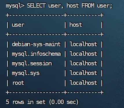 6. 执行以下 SQL 命令来查看所有用户及其主机: