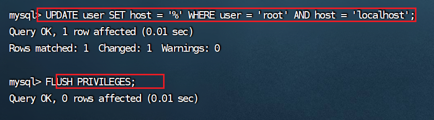 7. 决定修改现有用户(如 root 用户),需要更改用户的 host 值,以允许从任意 IP 地址连接。执行如下命令