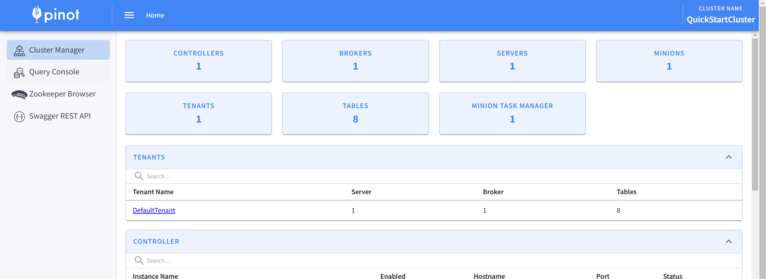 然后是在pinot上创建schema和table,简单点的话直接从pinot的swagger rest api里创建,这个时候pinot的服务已经正常跑起来了,直接访问 {pinot所在服务器ip}:9000 可以看到是这样的
