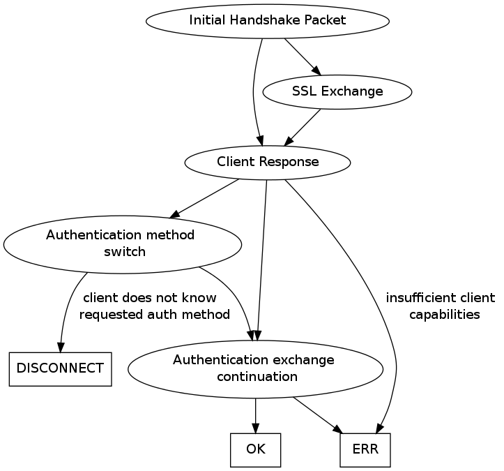 它从客户端connect()开始到服务器,服务器可能会发送一个ERR 数据包并完成握手或发送 Initial Handshake Packet客户端以 Handshake Response Packet. 在此阶段客户端可以请求 SSL 连接,在这种情况下,在客户端发送其身份验证响应之前建立 SSL 通信通道。在初始握手之后,服务器通知客户端用于身份验证的方法(除非它在握手期间已经建立)并且身份验证交换继续,直到服务器通过发送 接受连接 OK_Packet 或拒绝它 ERR_Packet。