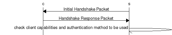 初始握手从服务器发送 Initial Handshake Packet. 在此之后,可选地,客户端可以请求与 建立 SSL 连接 SSL Connection Request Packet,然后客户端发送 Handshake Response Packet.