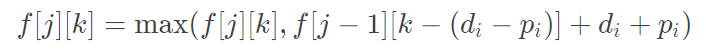 这个时候需要用到一个dp的常见技巧,就是把dp的一维放到dp数组的值里面,本来这个dp是四维的(有一维被滚动数组优化掉了),我们现在把dp状态设为dp[j][k]表示选了j个人,差为k的时候的最大和, 这样我们就把dp变成了3维,时间复杂度够了,用如下方程转移:
