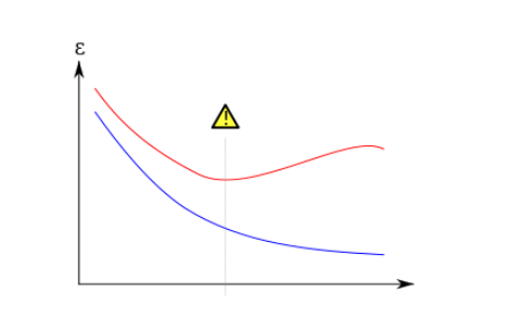 在上图中,蓝色表示训练误差training error,红色表示validation error。当训练误差达到中间的那条垂直线的点时,模型应该是最优的,如果继续减少模型的训练误差,这时就会发生过拟合。