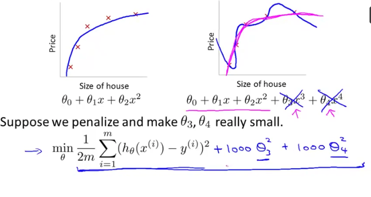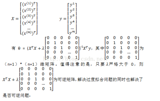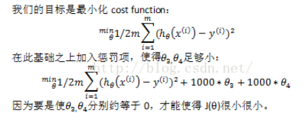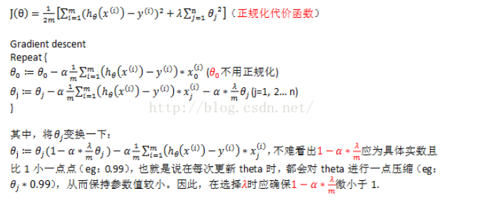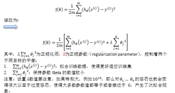 其中λ称为正则化参数,如果λ选取过大,会把所有参数θ均最小化,造成欠拟合,如果λ选取过小,会导致对过拟合问题解决不当,因此λ的选取是一个技术活。