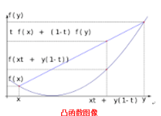凸函数:一个定义在向量空间的凸子集C(区间)上的实值函数f,如果在其定义域C上的任意两点x,y以及t∈[0,1]有: