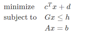 线性规划:如果凸优化中的目标函数ff和不等式约束条件gigi都为线性函数,那么此时的凸优化问题就成为了线性规划问题,其格式如下: