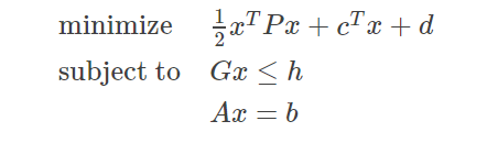 二次规划:如果凸优化中的目标函数ff为 二次函数,那么此时的凸优化问题就成为了二次规划问题,其格式如下: