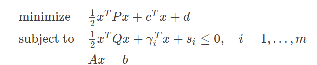 二次约束二次规划:如果在上述二次规划中再加入一个令其不等式约束条件也为二次的,那么这时候我们称该问题为二次约束二次规划问题, 其格式如下: