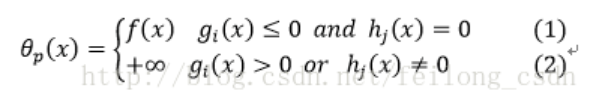 (1)式说明,当目标函数的约束条件都满足时,则自定义的函数便是上面需要求解的目标函数f(x),(2)则是只要目标函数的约束条件只有一个不满足,则自定义的函数便等于无穷大!