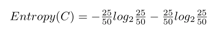 举个例子来说,我们有两个类别:红色(R)和蓝色(B)。第一个袋子里有 25 块红色巧克力。巧克力总数是 50。因此,p_i=25/50。蓝色类别也是这样处理。把这些值代入熵方程,我们得到以下结果: