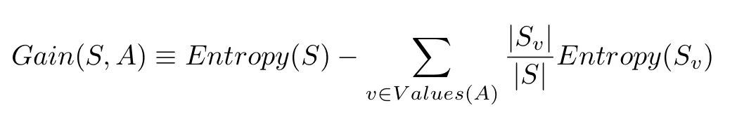 S 代表整个样本集,A 代表我们想要分割的属性。|S| 代表样本数量,|Sv| 表示当前属性 A 值的样本数量。