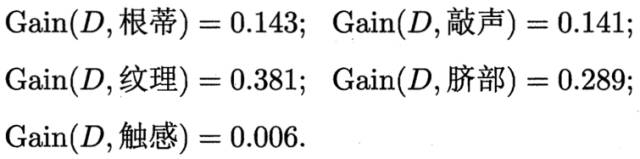 计算当前属性集合{色泽,根蒂,敲声,纹理,脐部,触感}中每个属性的信息增益