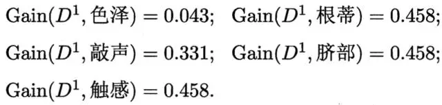比如:D1(纹理=清晰) = {1, 2, 3, 4, 5, 6, 8, 10, 15},第一个分支结点可用属性集合{色泽、根蒂、敲声、脐部、触感},基于 D1各属性的信息增益,分别求的如下: