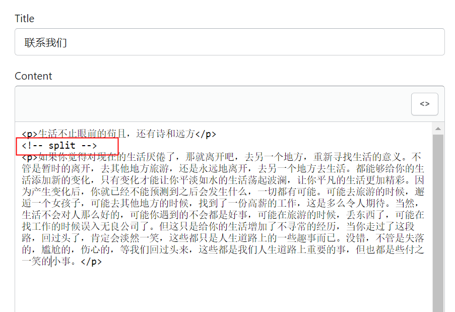 然后,在页面里切换成html的编写模式,在想要分割的地方输入<!-- split -->。这样,由<!-- split -->分割的两段话就分别显示在表单的上方和下方了。
