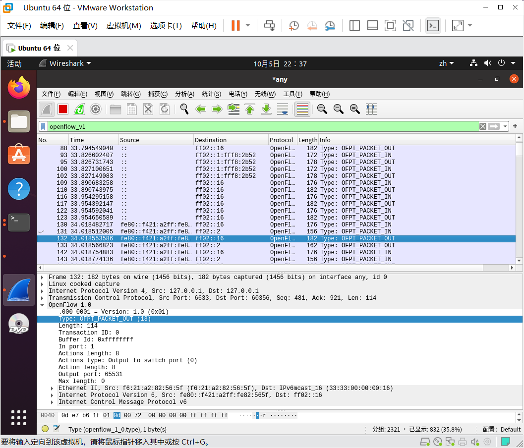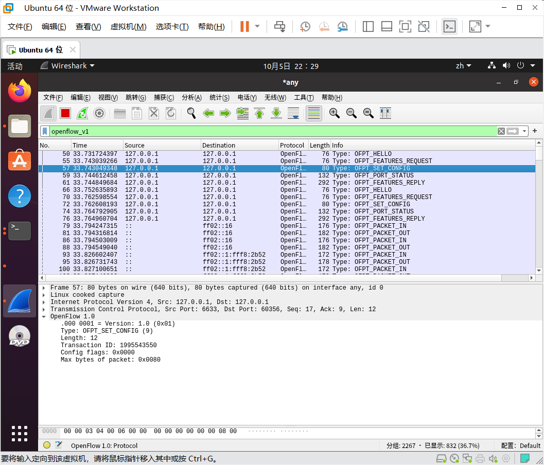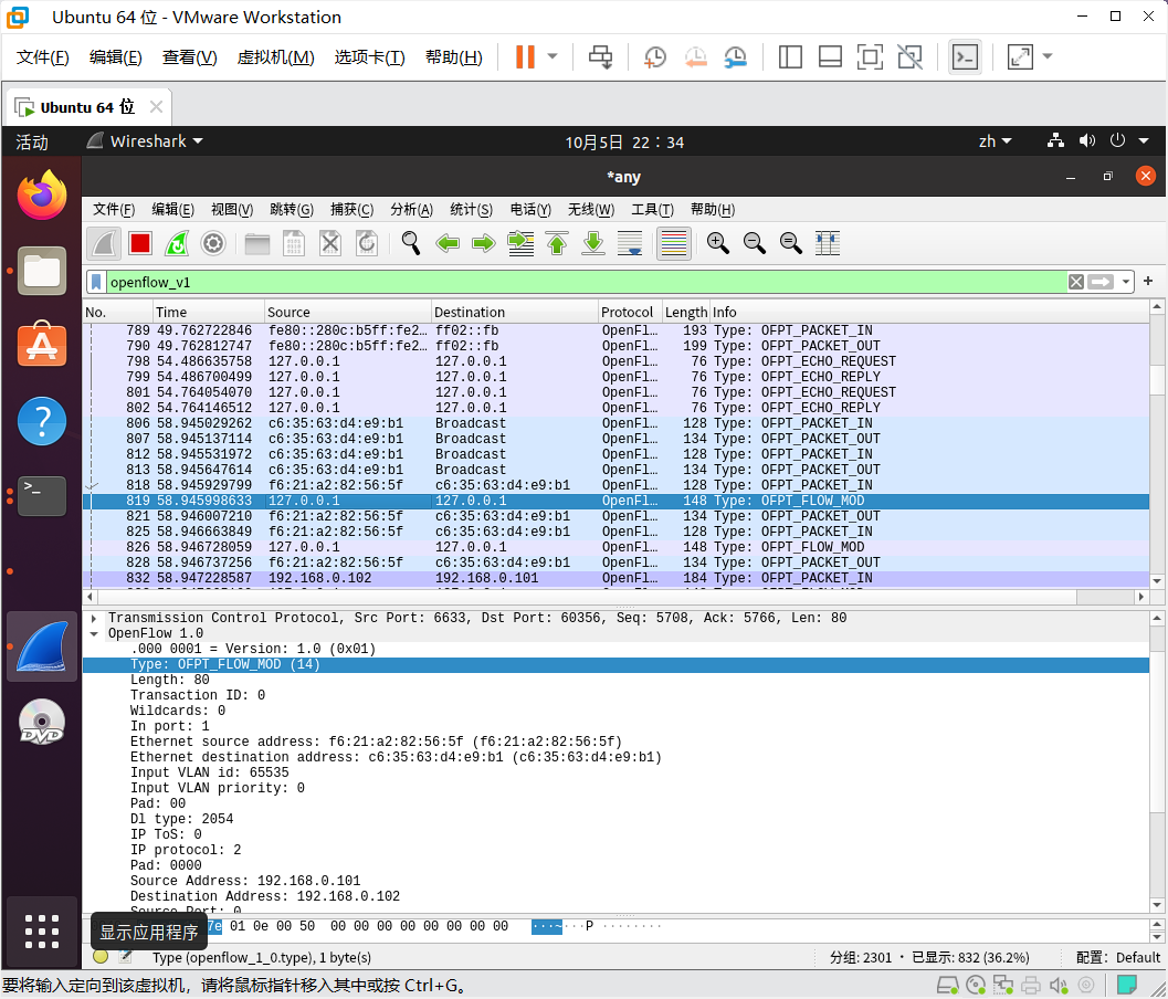 分析抓取的flow_mod数据包,控制器通过6633端口向交换机60356端口下发流表项,指导数据的转发处理