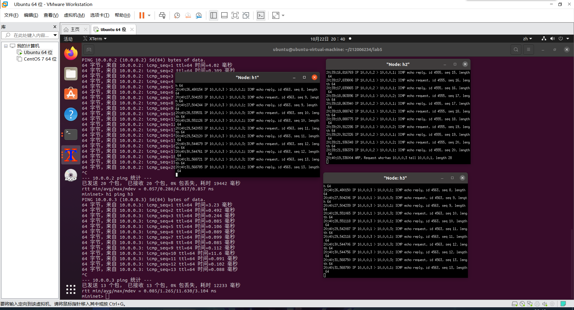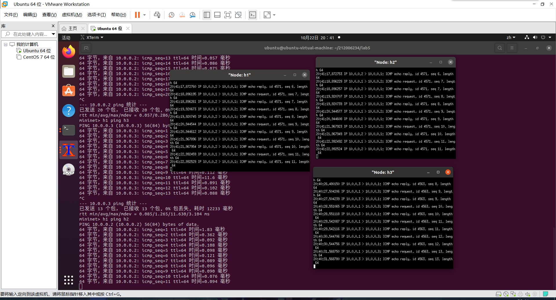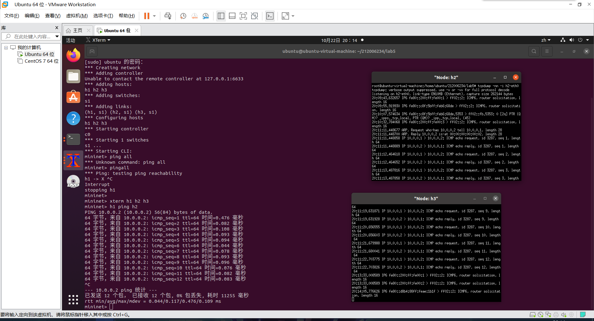 1、h1 ping h2、h2和h3的tcpdump抓包结果截图