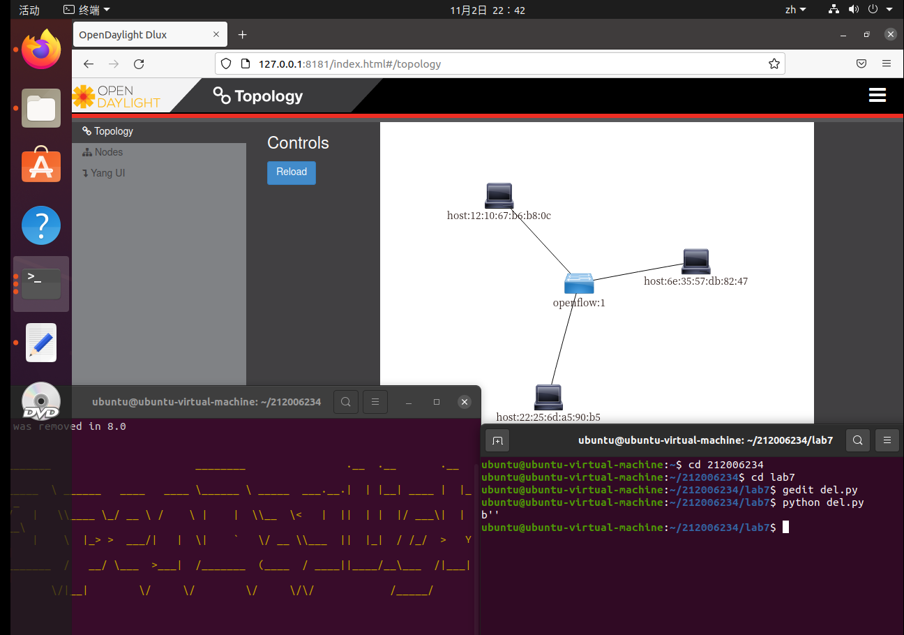 OpenDaylight或Ryu任选其一,编程实现查看前序VLAN实验拓扑中所有节点(含交换机、主机)的名称,以及显示每台交换机的所有流表项。