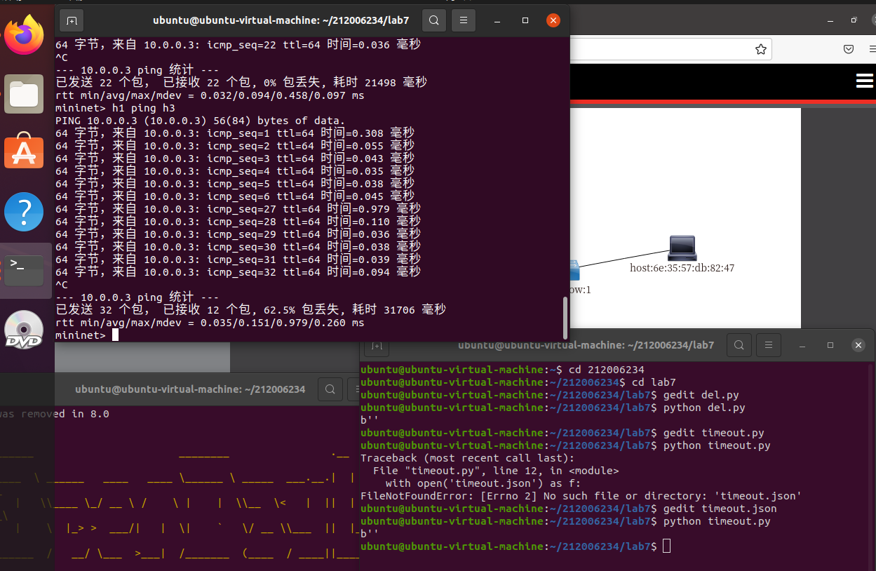 (3) 下发硬超时流表,实现拓扑内主机h1和h3网络中断20s。