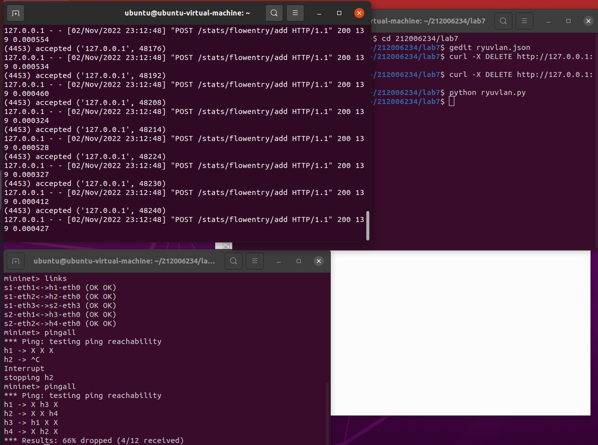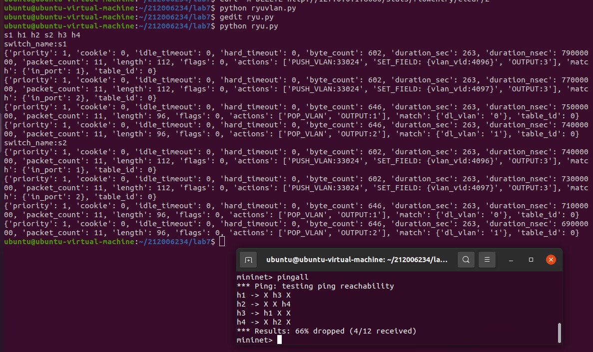运行ryutopo.py创建拓扑后删除流表,运行ryuvlan.py完成配置