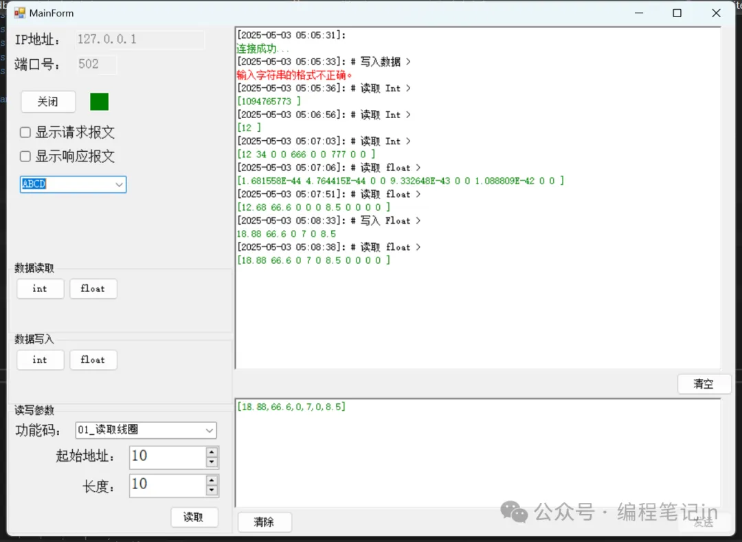 - 摘要:本文描述的内容是在上一篇文章的基础上增加读写int和float的数据功能、字节序读写功能(ABCD、BADC、CDAB、DCBA)。