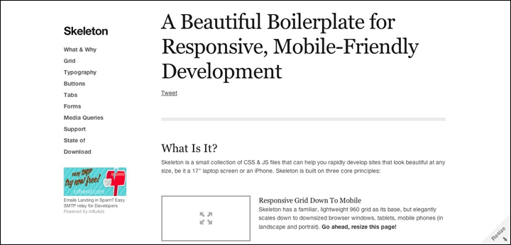 Skeleton是应用CSS和JS,应用它可以快速开发网站。无论是17寸的笔记本电脑还是iPhone,看起来效果都很不错。