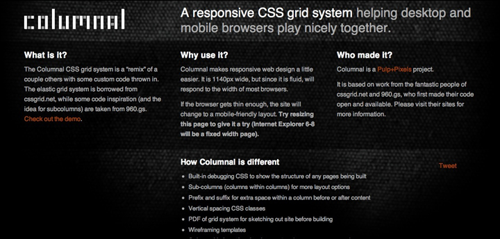 Columnal融合了标准代码和个性化代码。它的部分代码借鉴于cssgrid.net,还有些代码灵感则来自于960.gs。Columnal轻松解决网页设计兼容性问题。