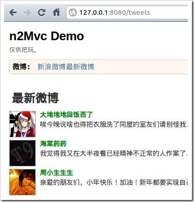 嗯嗯,一切正常。 好,接下来我们再写一个获取新浪微博最新微博的页面。首先,我们在config.js中增加一个route配置: